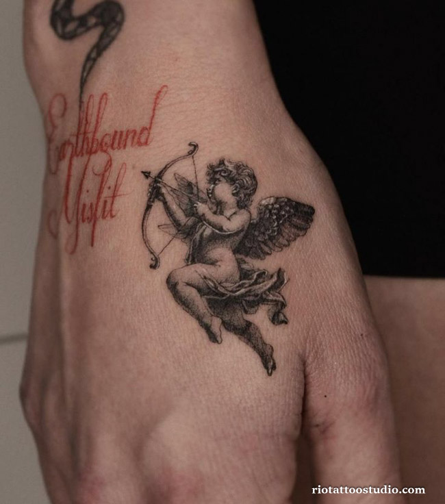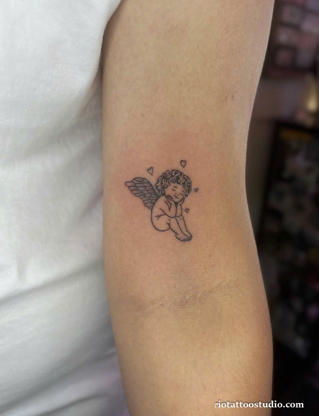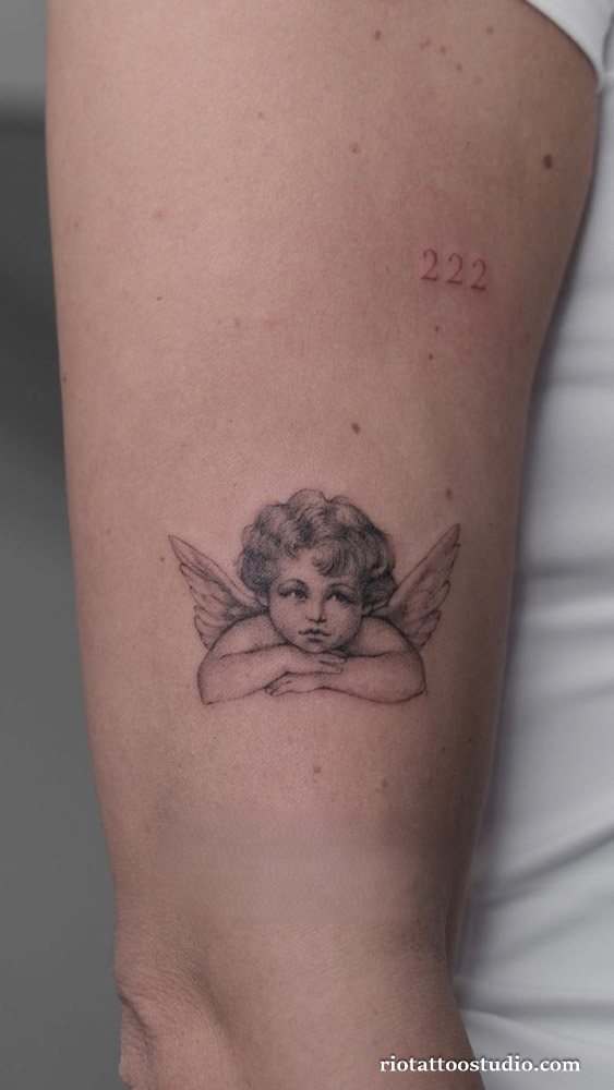 If you prefer a more “quiet” devotion, a small angel tattoo can be incredibly powerful in its simplicity. A tiny silhouette on the wrist, a micro-angel on the ankle, or a single wing behind the ear are popular choices for those who want a “hidden” protector.