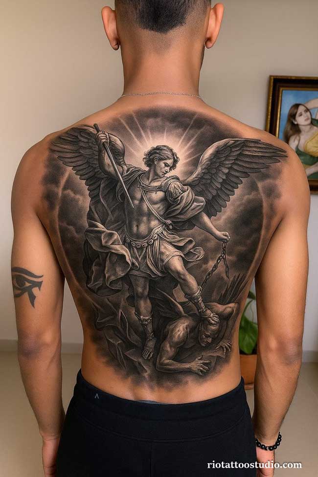 For many male enthusiasts, angel tattoos for men represent strength, courage, and the “warrior of light” archetype. These designs often depart from the soft, ethereal depictions found in classical art, leaning instead toward powerful figures clad in divine armor or standing in positions of authority. Whether it is a guardian protecting a child or a warrior angel ready for spiritual battle, these pieces serve as a daily reminder of a man’s duty to protect his values and his loved ones.