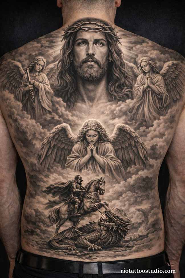 In the modern landscape of ink, men are increasingly choosing large-scale compositions that wrap around the chest or upper arm, creating a sense of “divine armor” that stays with them forever.