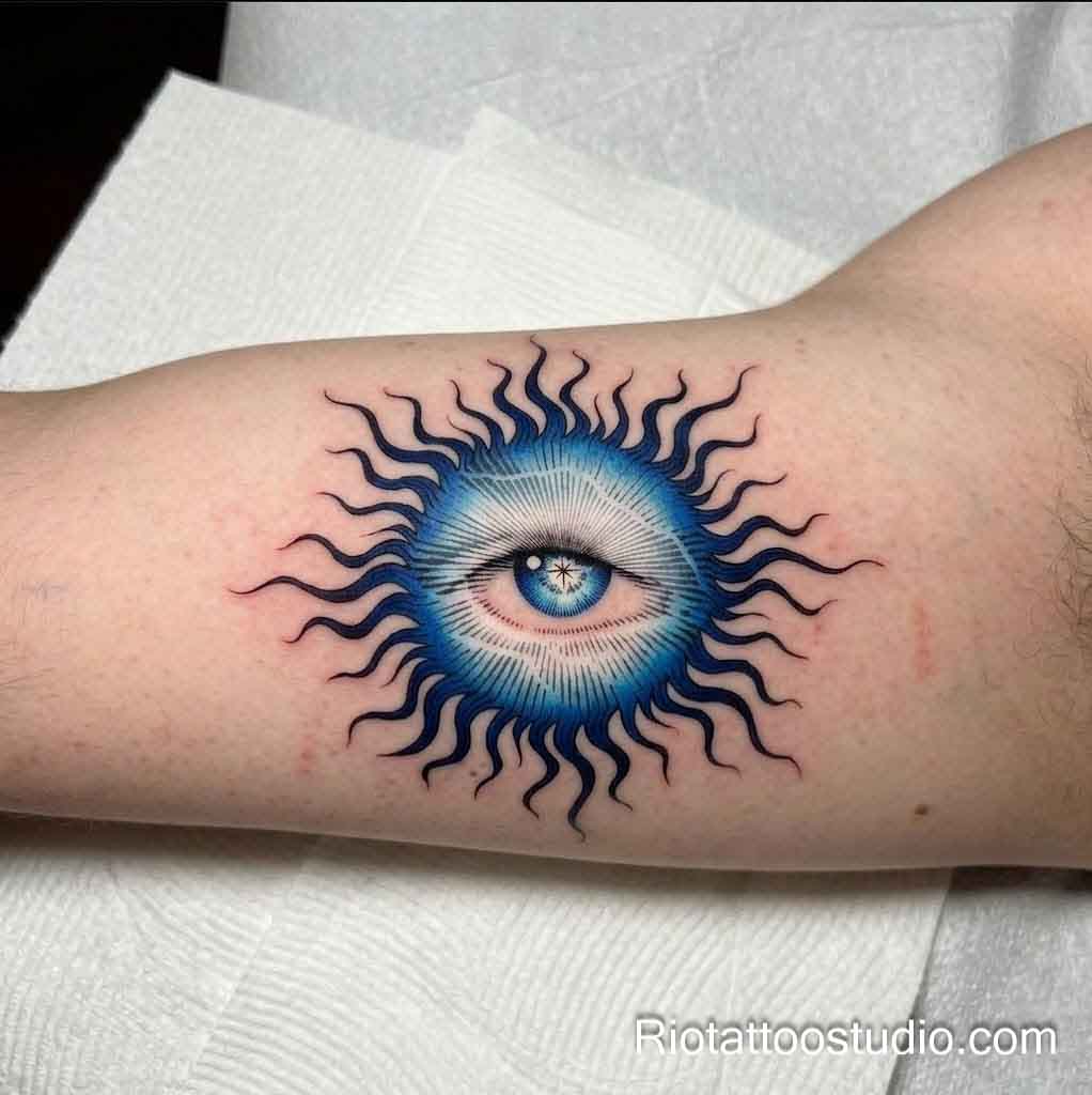 In a professional eye of evil tattoo, color layering is also used to create the “Transition Zone” between the white of the eye and the blue of the iris. This ensures that the colors don’t bleed into each other but instead create a smooth, gradient effect that mimics high-end glasswork. At Rio, we utilize premium imported inks that retain their vibrancy, ensuring your protective symbol stays bright and effective for a lifetime.