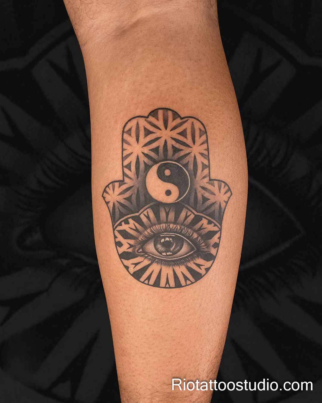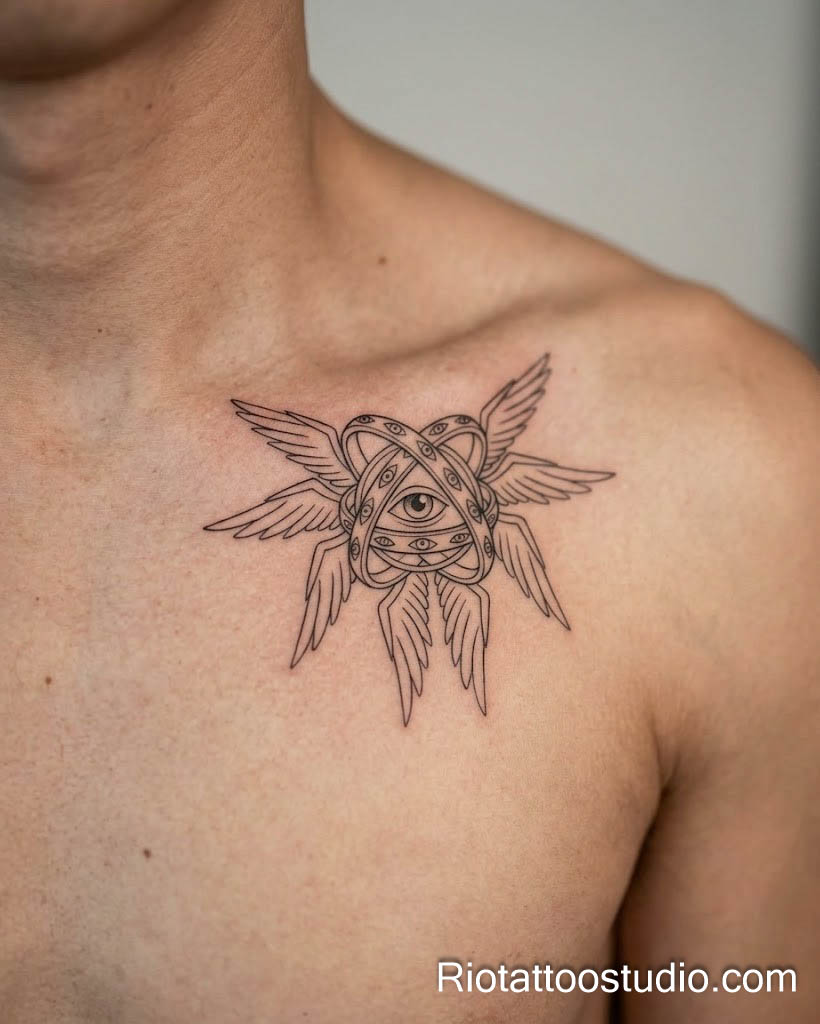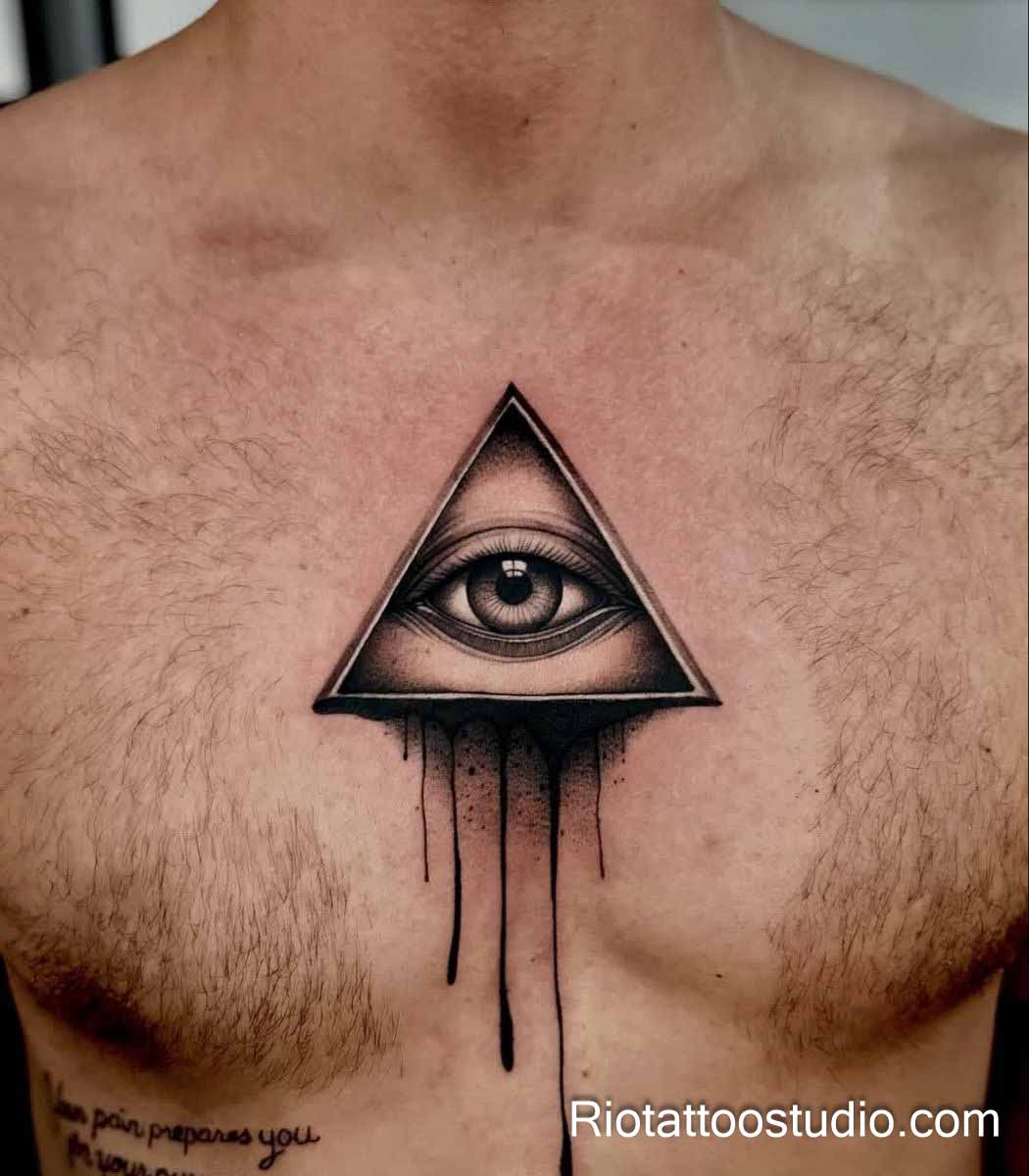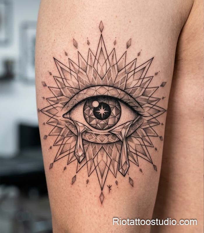 These concepts often involve “Sacred Patterns” like the Flower of Life or Metatron’s Cube to enhance the protective power of the eye evil tattoo. The contrast between the organic shape of the eye and the rigid, mathematical lines of the geometry creates a visually compelling piece. Our artists at Rio Tattoo Studio are experts at calculating these complex symmetries to ensure the tattoo looks perfect from every angle.