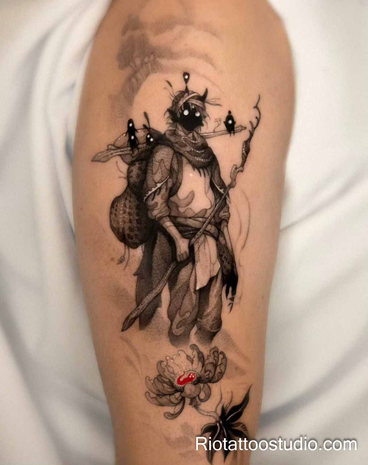 The realism in an eye of evil tattoo is further enhanced by the “Pepper-Shading” technique used around the eyelids and the skin folds. This contrast between the vibrant, cool blue of the eye and the warm, realistic skin tones creates a multi-dimensional effect that is truly breathtaking. Our expert, Tattoo Artist Ha Trung, is renowned for these high-realism pieces that appear three-dimensional from every viewing angle.
