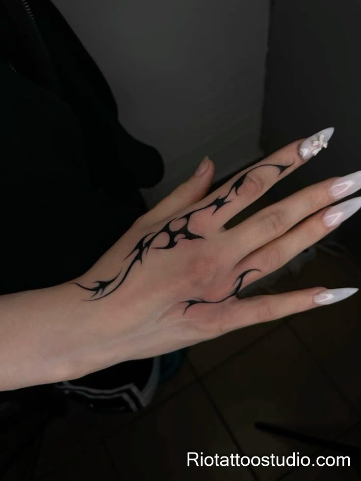 Cool finger tattoo on hand – bold line work design at Rio Tattoo Studio