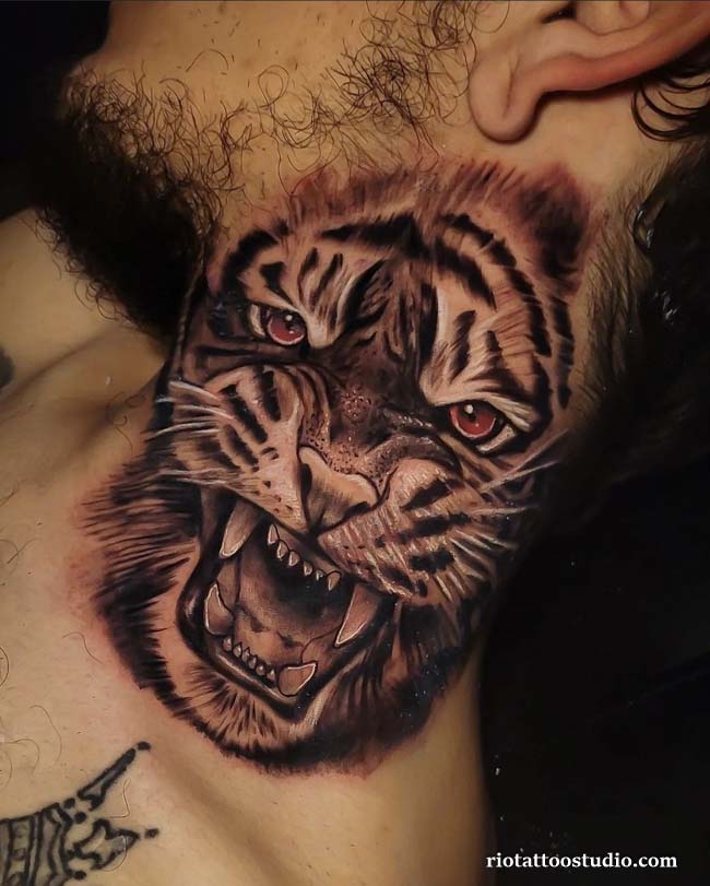Animal symbols like the wolf, tiger, or eagle are among the most sought-after neck tattoos for men. An eagle with outspread wings across the throat or a tiger prowling up the side of the neck symbolizes power and fearlessness.