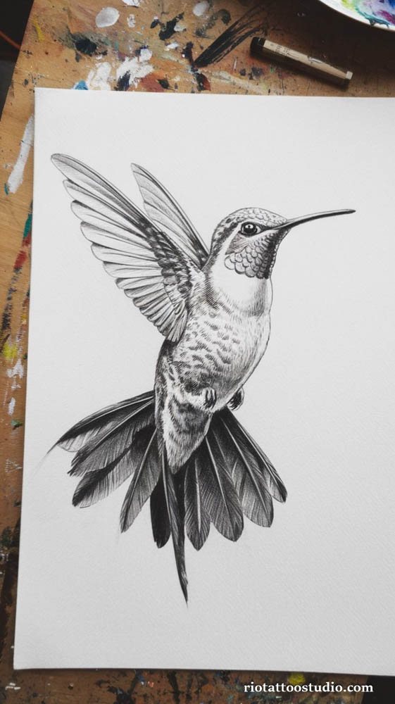Detailed hummingbird tattoo drawing and shading techniques