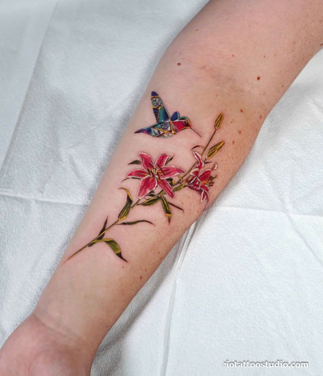 Vibrant colorful hummingbird tattoo with flowers on arm, best hummingbird tattoo ideas