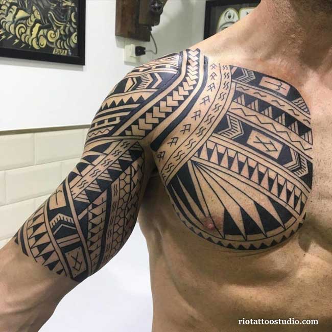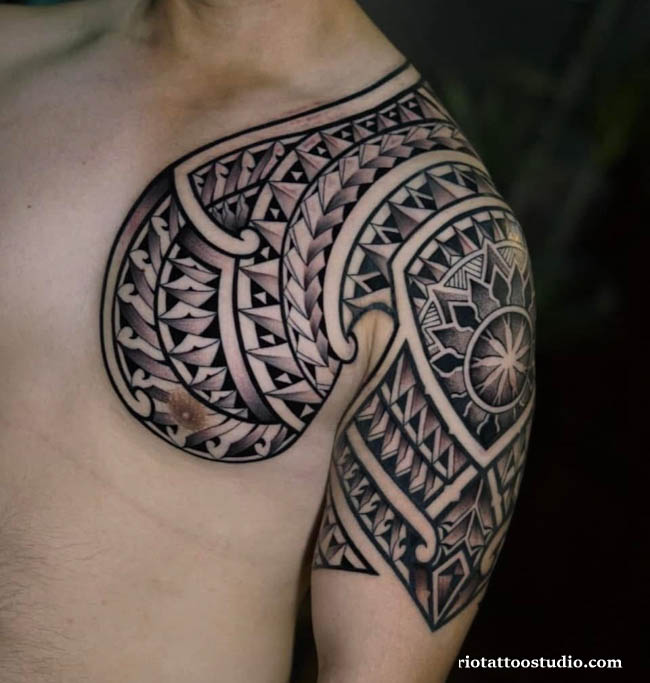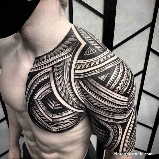 The beauty of tribal and geometric art lies in its relationship with human anatomy. The thick, solid black bands and intricate geometric patterns are designed to wrap around the deltoid, creating an optical illusion that broadens the shoulders and defines the upper arm.