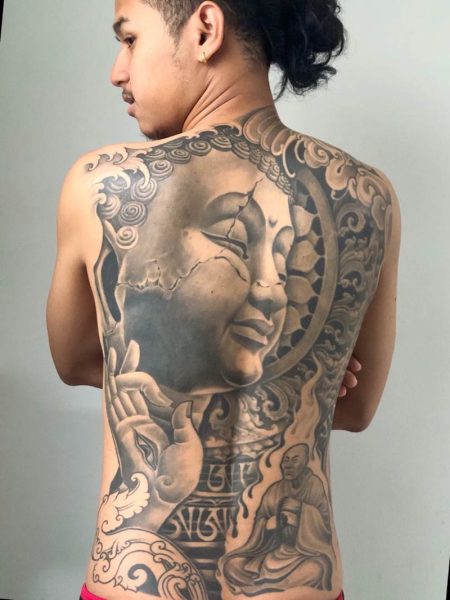 Hình xăm tay Phật ở lưng minh chứng cho một tâm hồn hướng thiện, yêu thích sự bình an, và luôn có khát khao vượt qua nghịch cảnh bằng sự điềm tĩnh, tỉnh thức.
