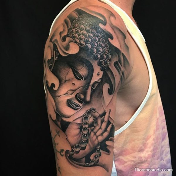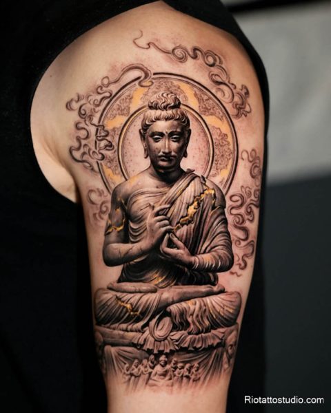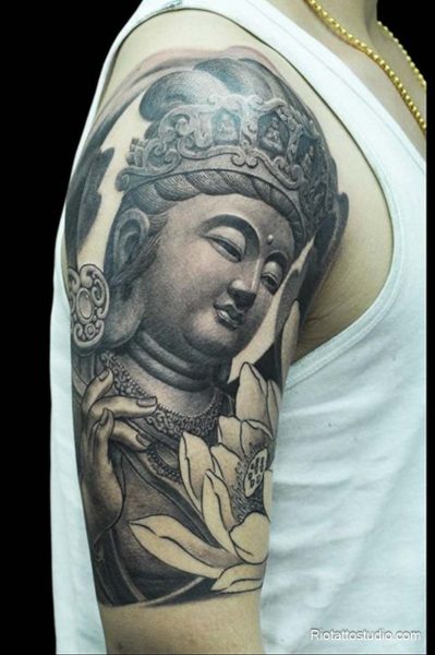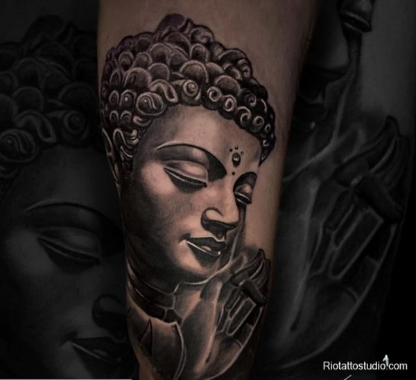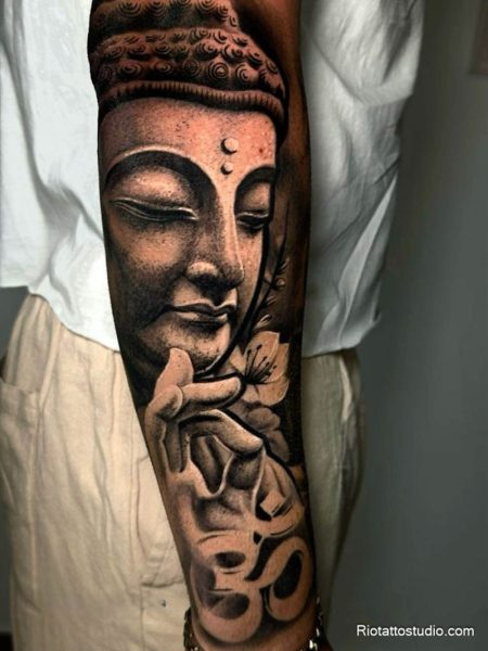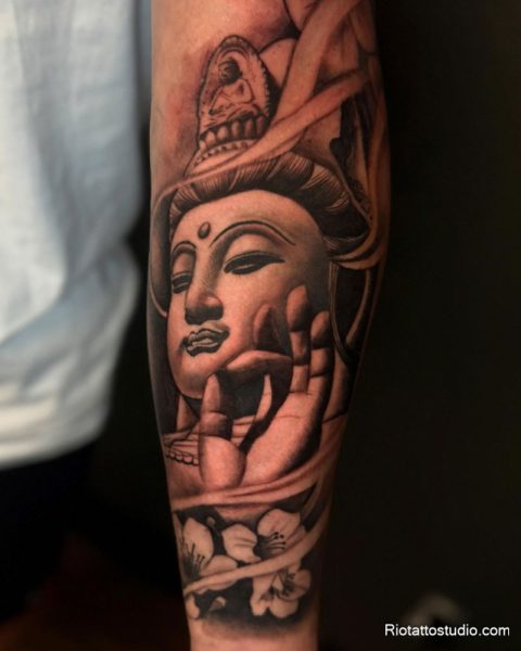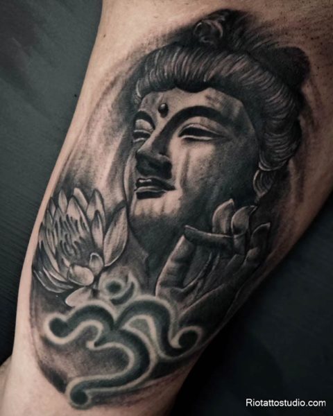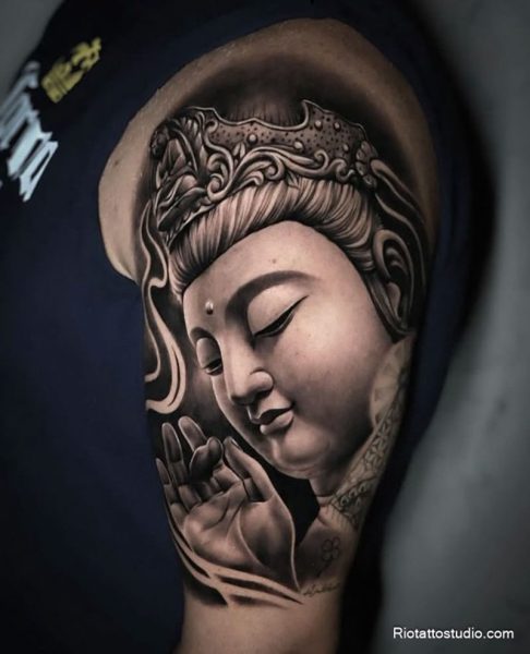 - Kết hợp với biểu tượng tâm linh khác: Tràng hạt, đài sen, chữ Phạn hoặc ánh sáng vầng hào quang giúp hình xăm tăng thêm chiều sâu.