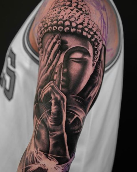 Hình xăm chắp tay Phật ở cánh tay (vị trí dễ nhìn thấy và thường lộ ra ngoài) giúp bạn thể hiện sự tự hào về đức tin, và sẵn sàng để chia sẻ niềm tin tích cực đó với thế giới xung quanh.