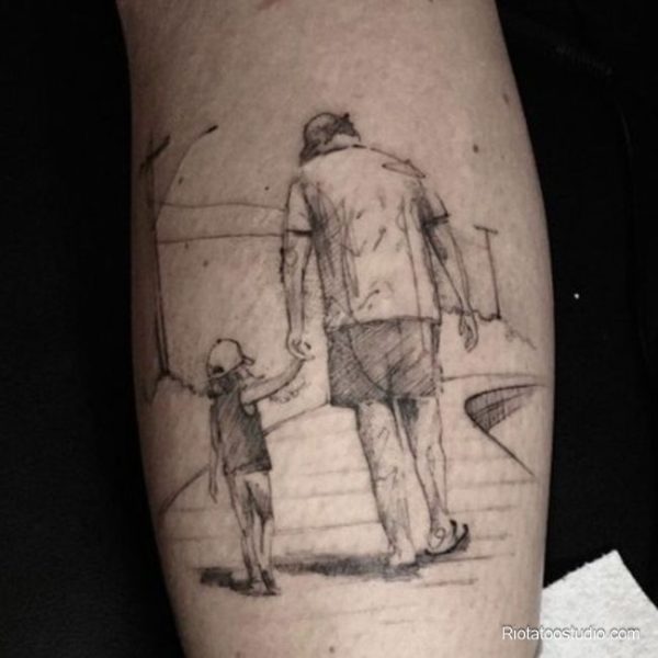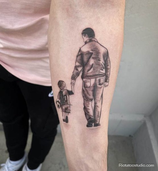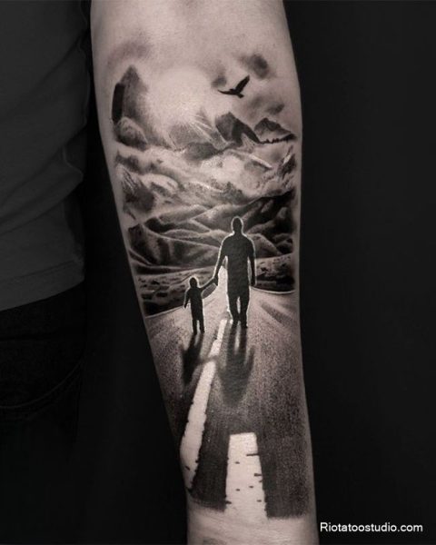 Hình ảnh người cha dắt tay con bước đi trên đường đời là một biểu tượng giàu cảm xúc. Nó không chỉ đơn thuần là hành động nắm tay, mà còn là sự chỉ dẫn, định hướng và che chở. Trong từng bước đi của con luôn có dấu chân của cha đồng hành phía sau thầm lặng mà kiên cường. Mẫu hình xăm này thường được thiết kế theo phong cách silhouette (hình bóng đổ), vừa tối giản lại vừa gợi nhớ. Một số người còn kết hợp thêm dòng chữ ý nghĩa hay khắc tên, năm sinh của cha con để cá nhân hóa sâu sắc hơn.