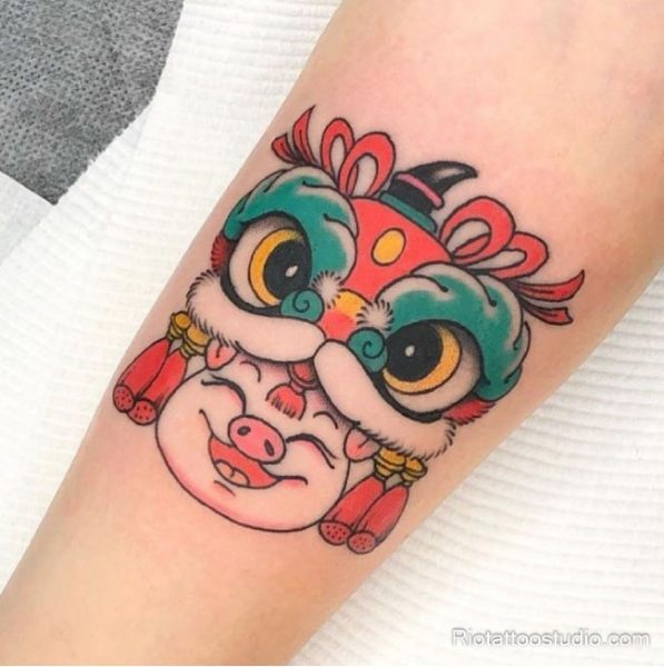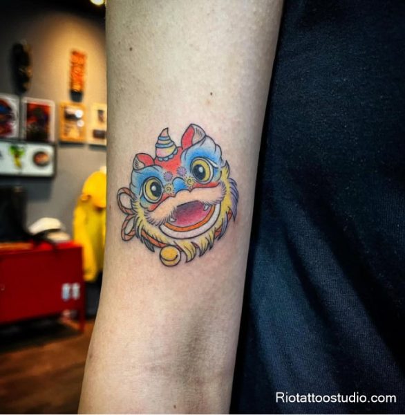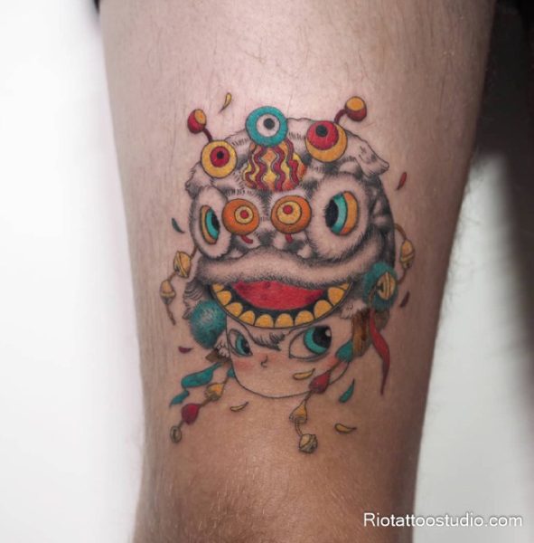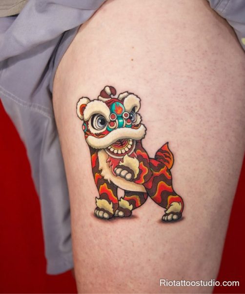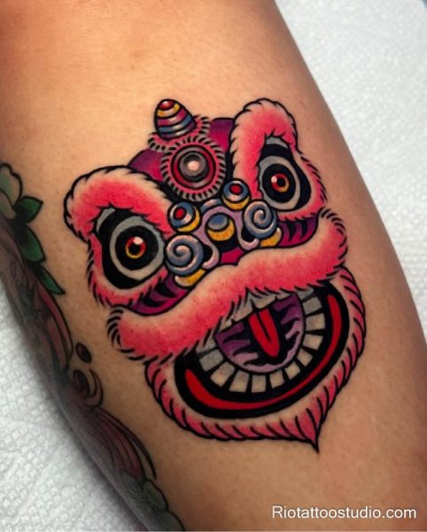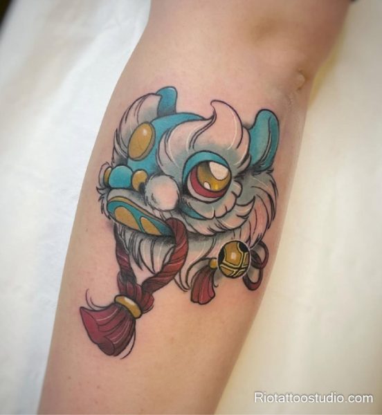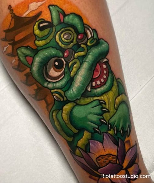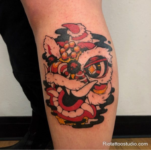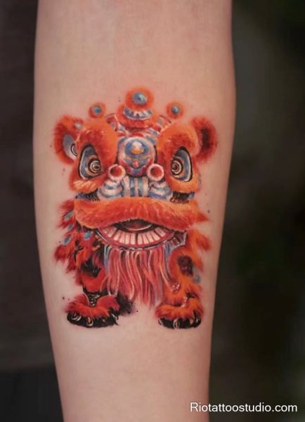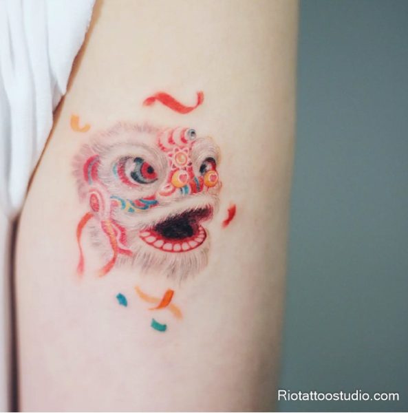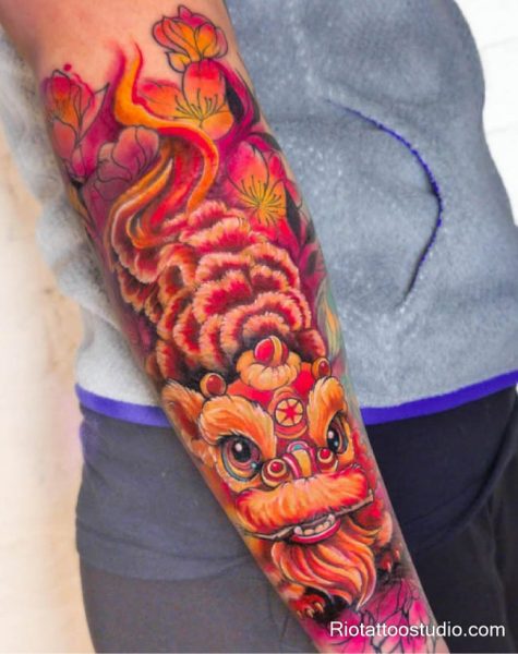 Hình xăm đầu lân sư rồng màu sắc rực rỡ – Phong thủy tài lộc
