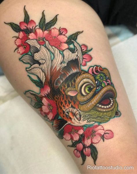Hình xăm đầu lân truyền thống kết hợp họa tiết
