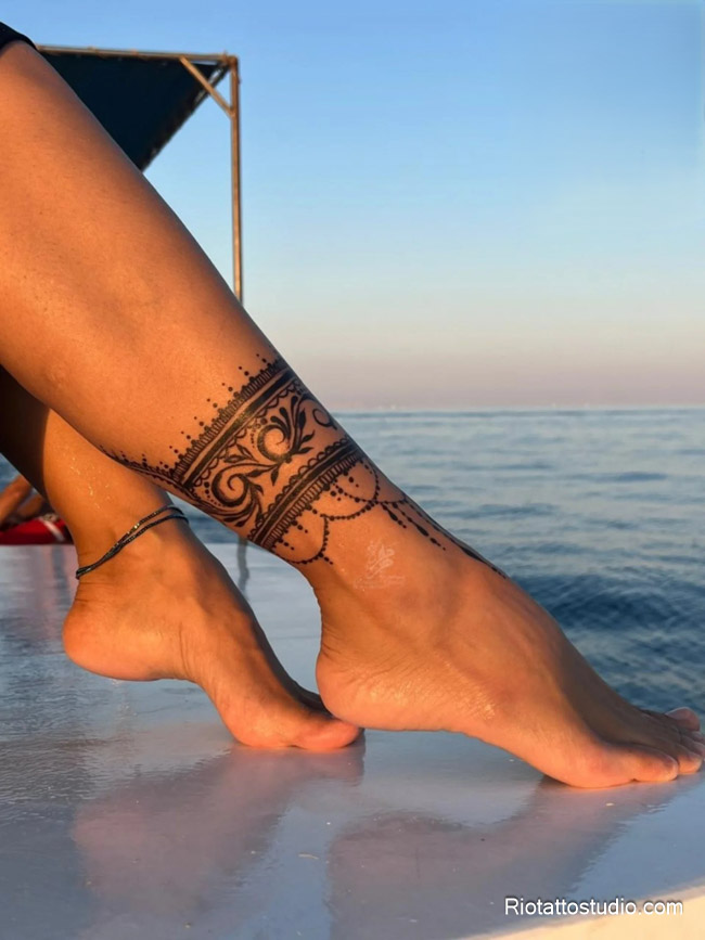 Những cô nàng yêu phong cách boho tự do và du mục thường chọn Henna hoa văn ở mắt cá chân, bàn chân hoặc bắp chân. Henna chân thường sử dụng các họa tiết hoa văn dây leo, lông vũ hoặc các chi tiết hình học kéo dài từ mắt cá chân lên đến bắp chân.